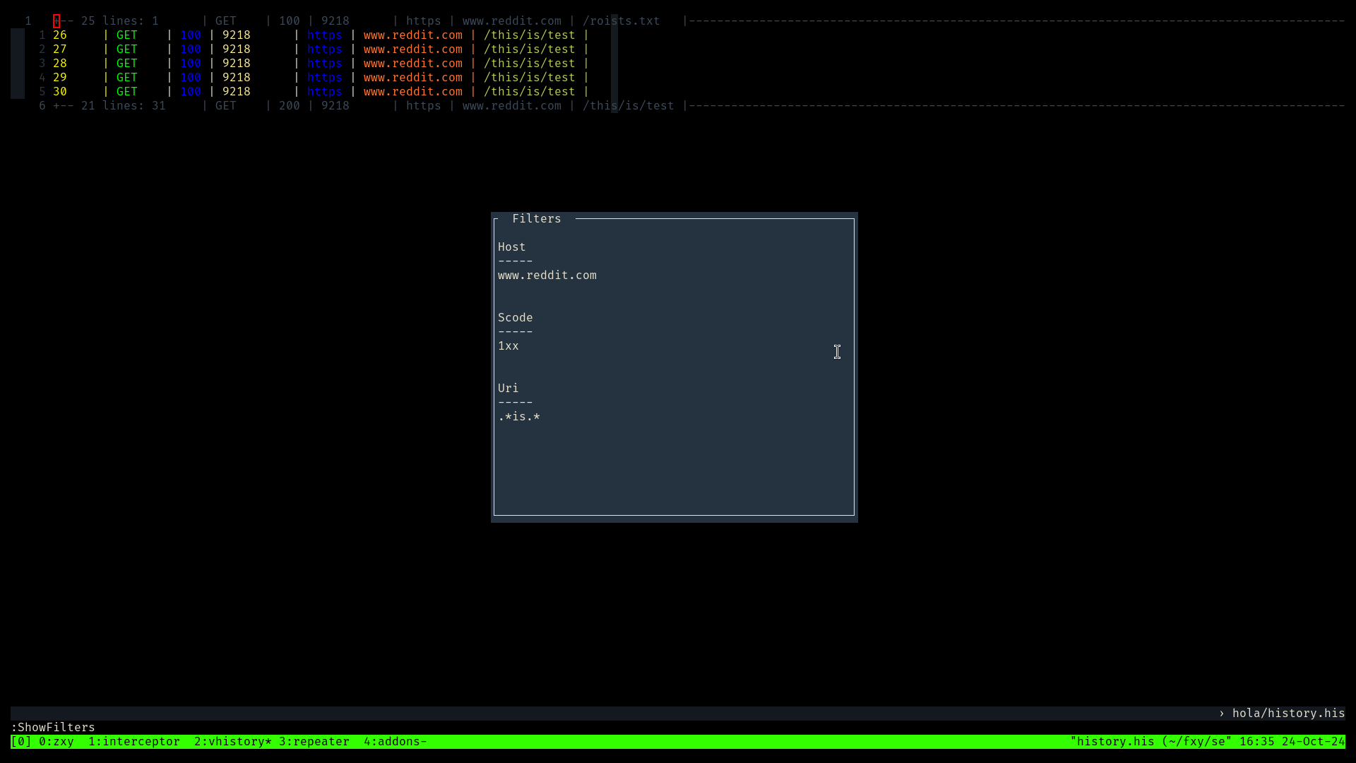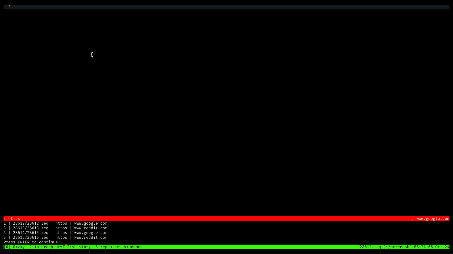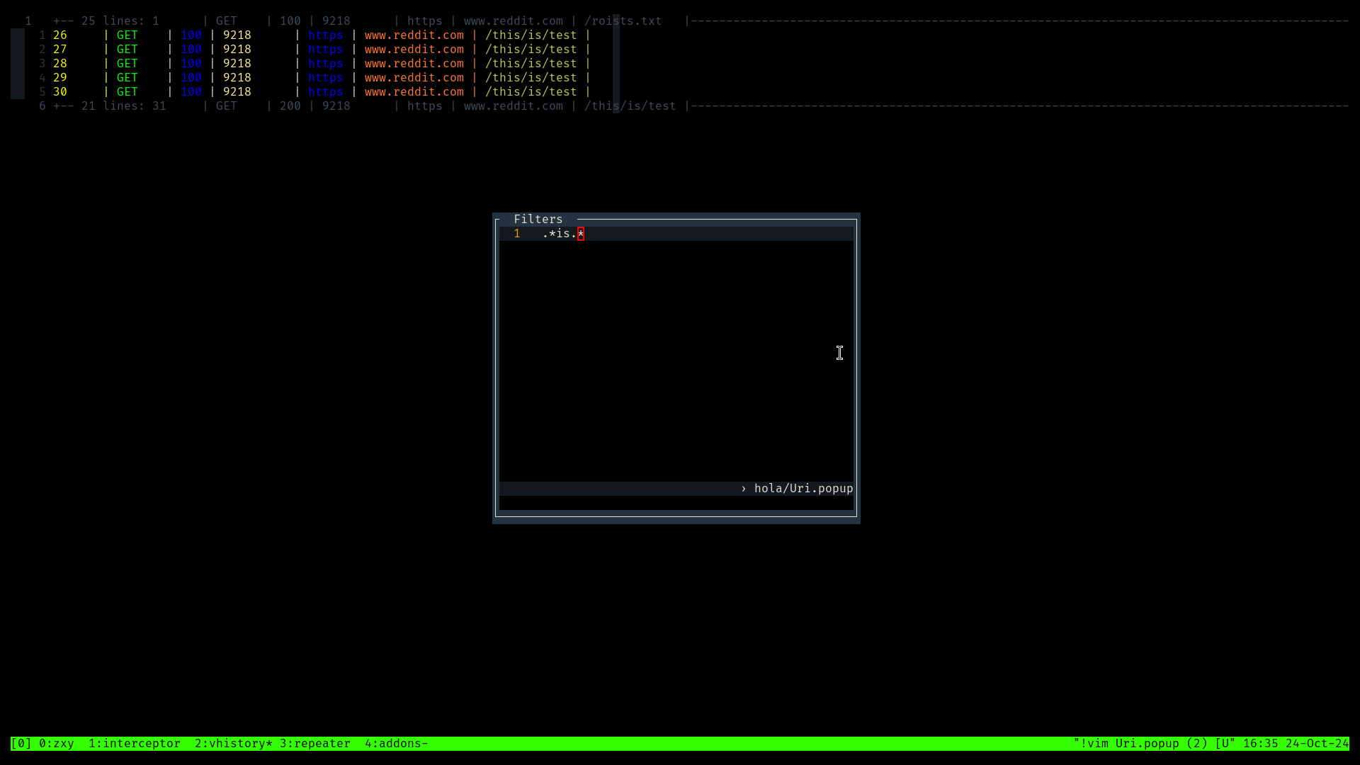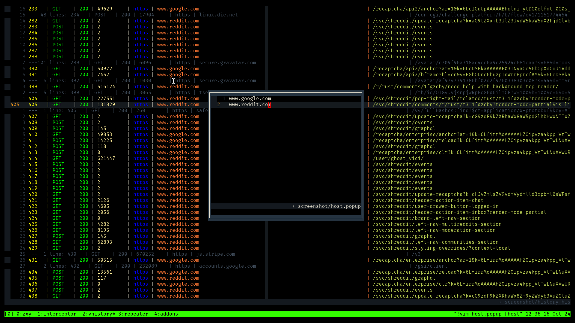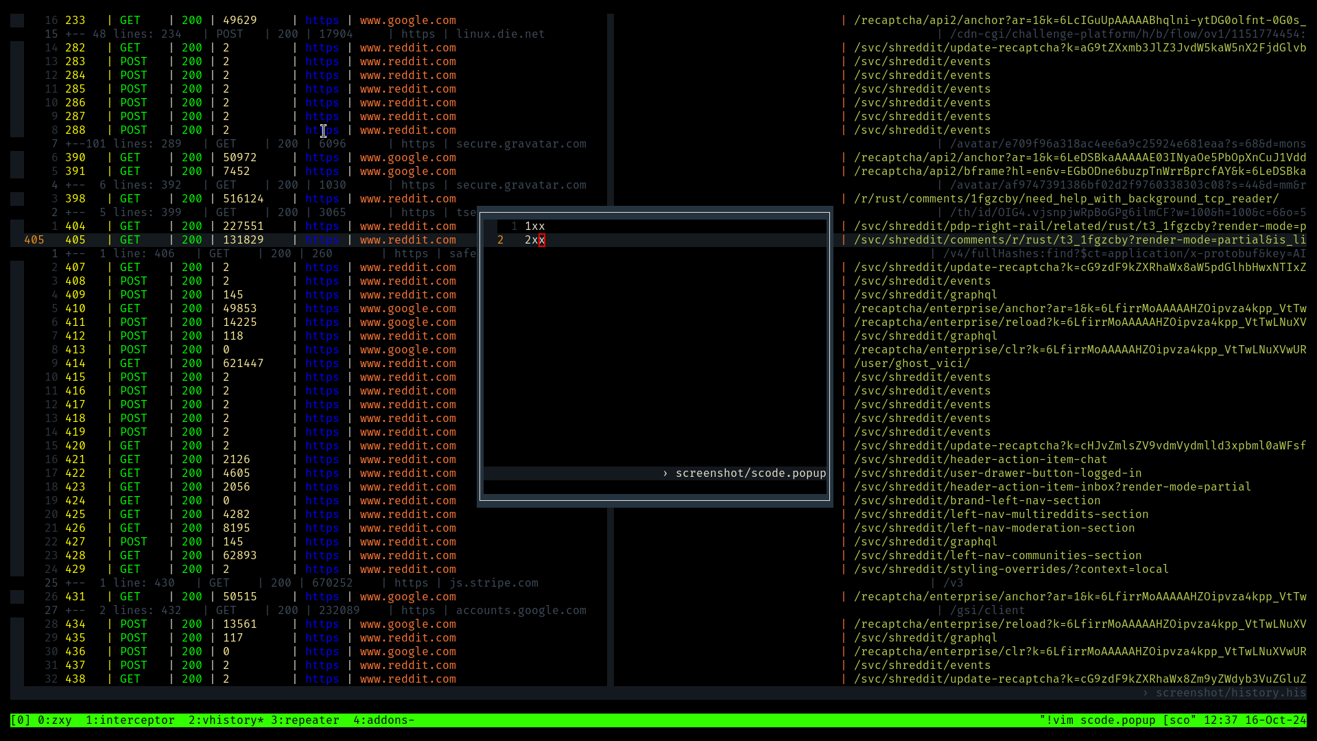 Terminal based intercepting proxy written in rust with tmux and vim as user interface.