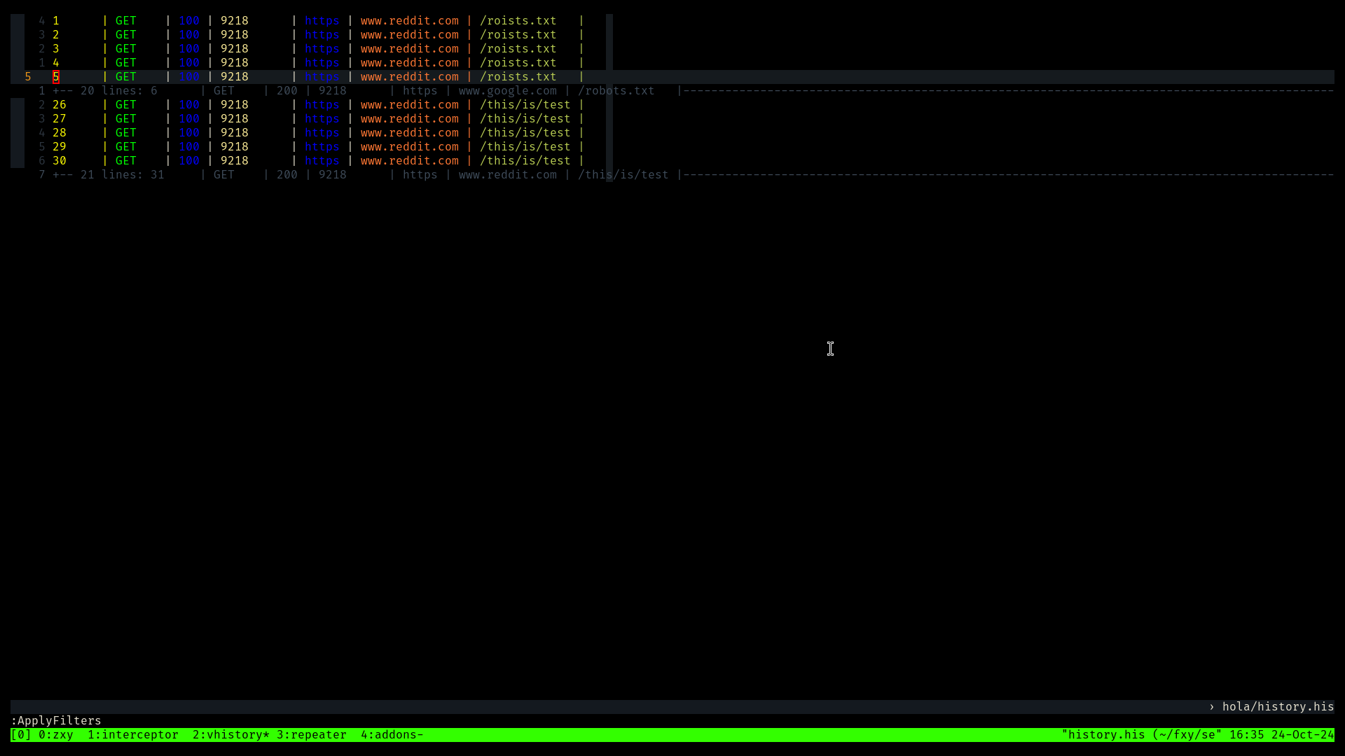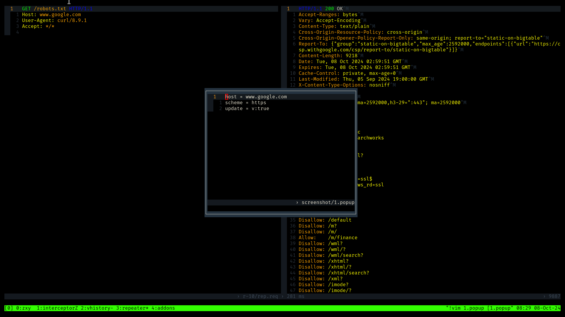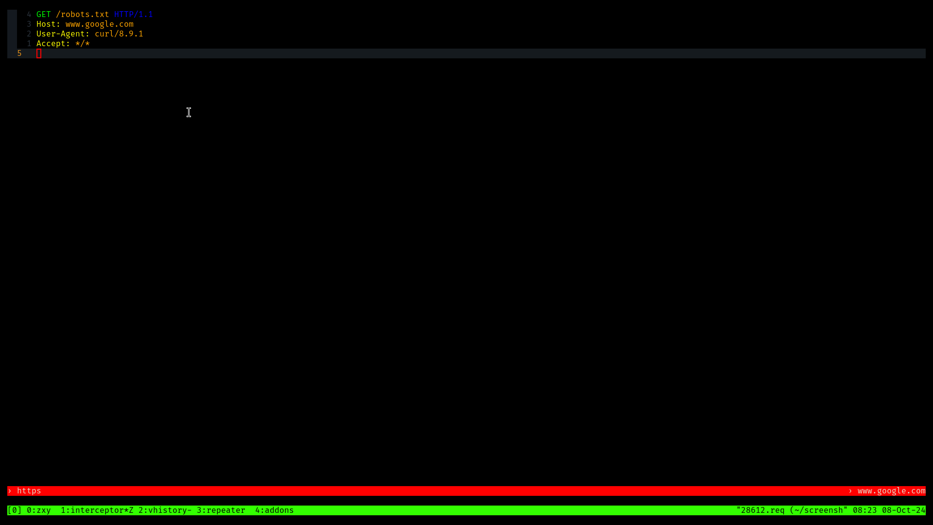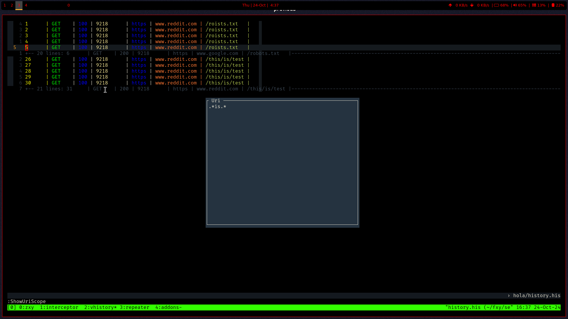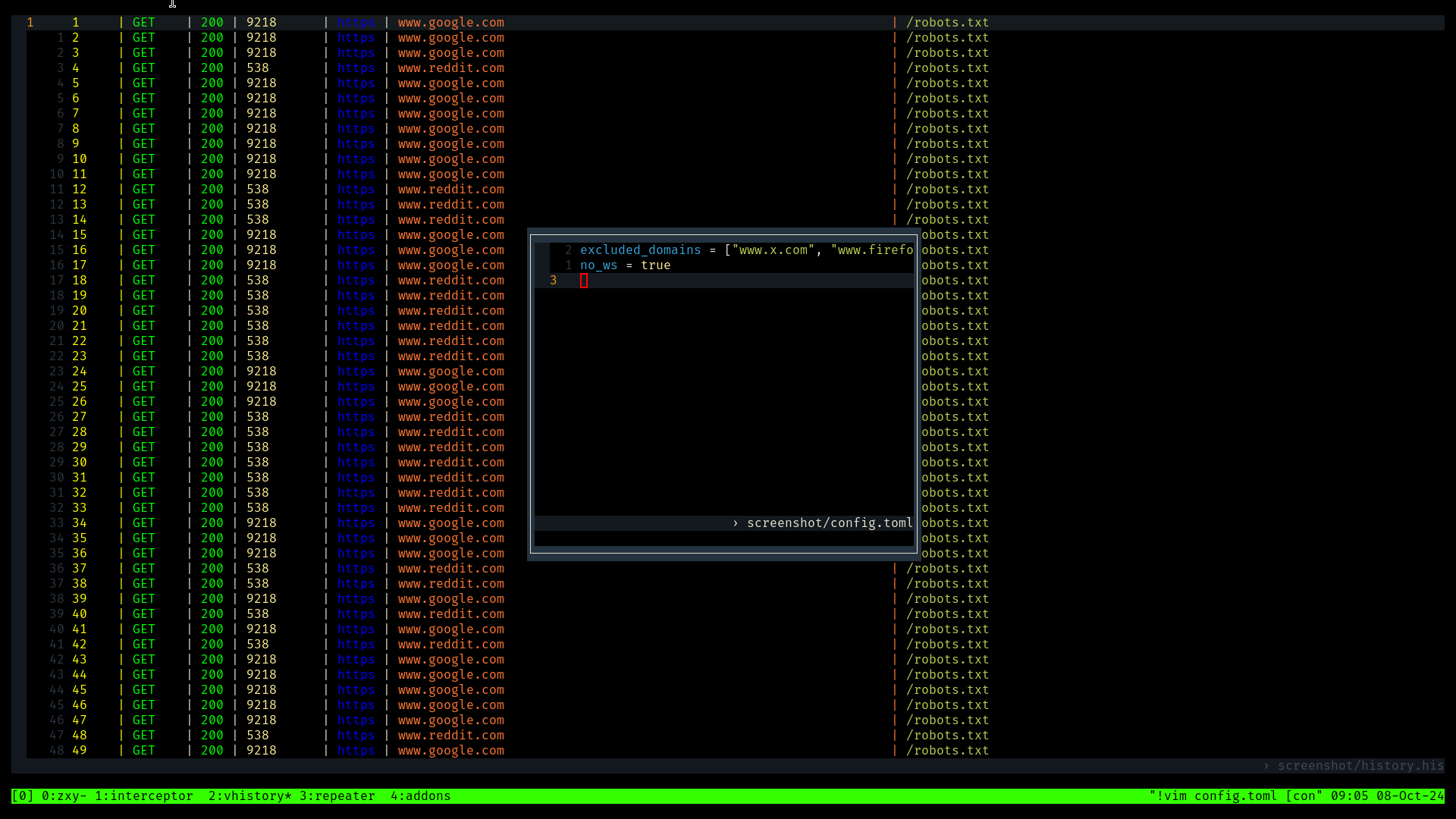 Terminal based intercepting proxy written in rust with tmux and vim as user interface.